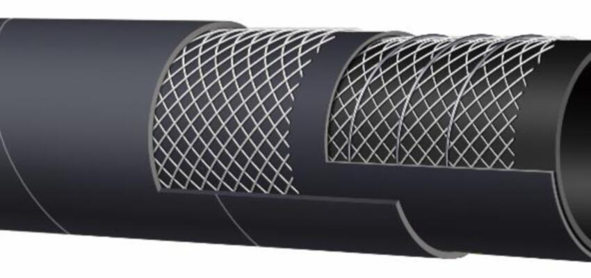 Flatrullad stamledningsslang med innertub & yttertub av svart SBR-gummi och armering av två lager textil.